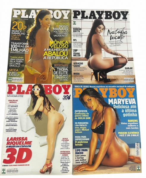 • Lote com 4 Revistas Playboy Brasil de colecionador (Julho/2003, Outubro/2007, Setembro/2010, Setembro/2014), destacando as capas de Maryeva, Mônica Veloso, Larissa Riquelme (3D) e Natalia Inoue. Marcas do tempo.