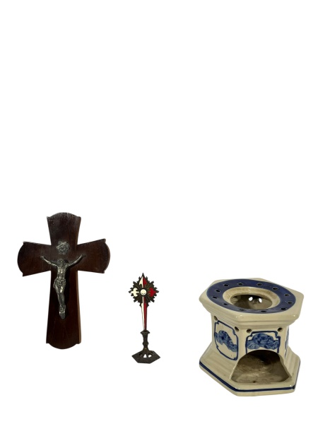 • Lote com crucifixo de madeira com Cristo em metal com detalhe na mão, crucifixo de mesa e incensário/aquecedor de cerâmica hexagonal com decoração azul. -dim- crucifixo madeira 11x16a / crucifixo mesa 3,5x9,5a / aquecedor 11x10x8