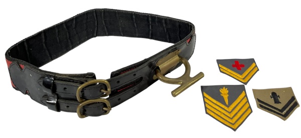 • Lote composto de 4 itens, sendo 1 antigo cinto militar de bombeiro em couro preto com fivelas de metal tamanho 0,85, acompanhado de 3 insígnias de tecido brasileiras distintas do corpo de bombeiros, representando saúde (cruz vermelha), comando/instrução (tocha) e combate a incêndio (hidrante). Marcas do tempo. -dim- patch 7,5x9