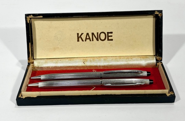 • Lote com 2 peças sendo uma lapiseira e uma caneta ambas prateadas da marca Kanoe, acompanha caixa. Caneta não acompanha carga.
