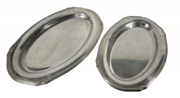 • Lote composto por duas travessas Tramontina ovais produzidas em Inox prateado, com bordas decoradas e dimensões distintas. Marcas do tempo -dim- 32x48 maior / 28x42 menor