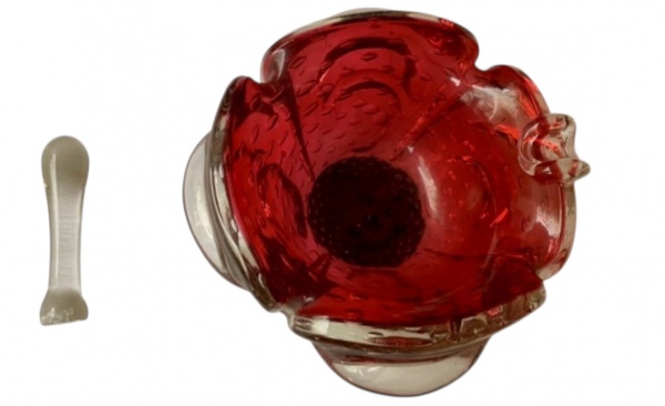 • Cristal Murano Anos 50 - Cinzeiro na cor vermalha com detalhes de bolhas, e com relevos dito orelha de macaco. Acompanha apagador.