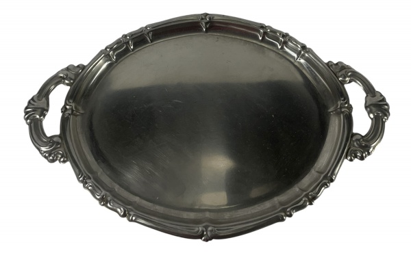 • Bandeja oval decorativa Wolffinox em aço inox, com detalhes ornamentados nas bordas e alças. Marcas do tempo. -dim- 31x50