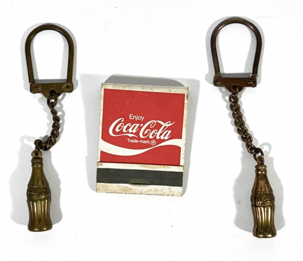 • Lote com 3 itens colecionáveis da Coca-Cola sendo 2 chaveiros em formato de garrafa produzidos em metal na cor Bronze e uma caixa de fósforos da marca produzidos pela American Match Co. NY