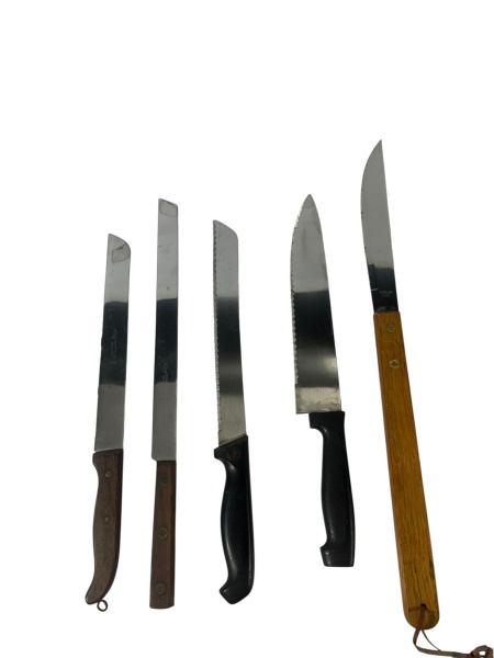 • Lote de 5 facas de cozinha, variando em tamanho e tipo de lâmina. O lote inclui facas com cabo de madeira e cabo preto, algumas com lâmina serrilhada. Marcas do tempo. -dim- 40 maior 30 menor