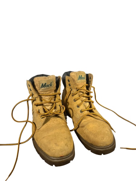 • Par de botas de trabalho da marca Mack, tamanho 10, com cabedal de couro legítimo, outros materiais sintéticos, design isolado e solado resistente a óleo.