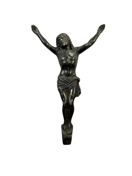 • Corpus de crucifixo produzido em estanho, de origem europeia do século XX. Marcas do tempo. -dim- 10x18