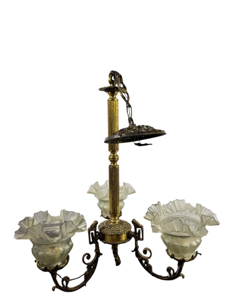 • Lustre antigo no estilo Art Nouveau produzido em bronze com três braços e cúpulas em vidro fosco com bordas franzidas, em bom estado de conservação. -dim- 46x40x48