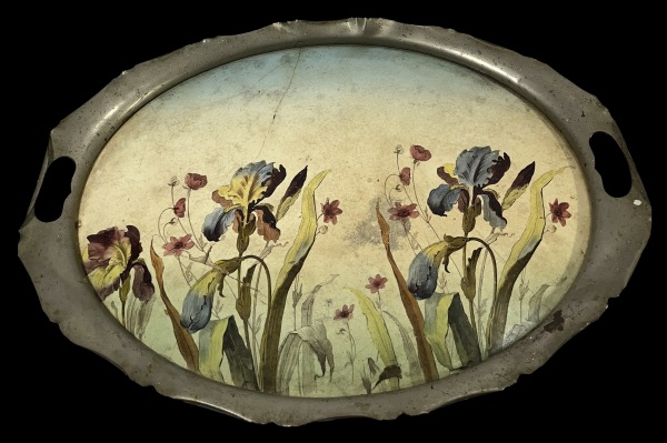 • Antiga bandeja oval em metal prateado, com o centro em cerâmica ou porcelana pintada à mão com motivos florais de íris. A peça apresenta craquelê e marcas do tempo. -dim- 51x37