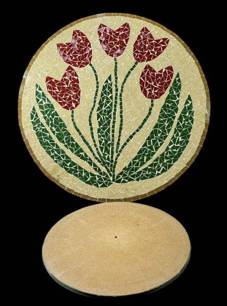 • Centro de mesa artesanal em mosaico de pastilhas de vidro com motivo floral de tulipas sobre base circular de MDF. Inclui base adicional de MDF para elevação ou uso como pedestal. -dim- 48d