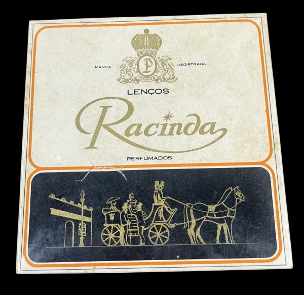• Caixa vintage de lenços perfumados, marca Racinda, contendo 6 unidades na cor bordô, com embalagem original. Marcas do tempo. -dim- 14,5x14,5
