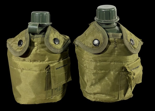 • Lote de 2 cantis táticos Guepardo (aprox. 950ml) em plástico com capas em nylon verde-oliva, com nomes manuscritos. Marcas do tempo. -dim- 15x9x21