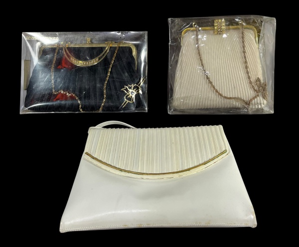 • Lote com 3 bolsas de noite/clutches vintage: Duas plissadas com alças de corrente (uma preta, uma off-white) e uma clutch envelope branca plissada. Marcas do tempo. -dim- Bolsa preta 22x14 branca 24x17 17x16 off-white