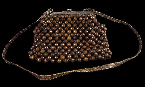 • Bolsa Vintage de Contas de Madeira Marrom (décadas de 40/50), estilo Kiss Lock com alça de ombro e forro de tecido interno. Marcas do tempo. -dim- 26x16