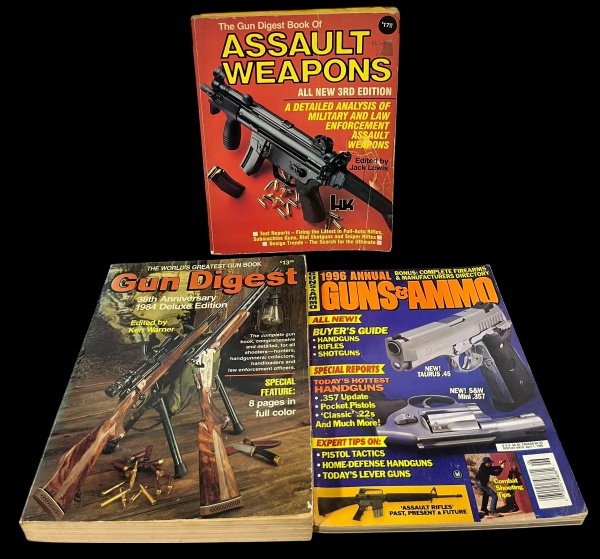 • Lote de 3 volumes de publicações vintage de referência sobre armas de fogo: Inclui as edições de colecionador de capa dura Gun Digest 1984 Deluxe e Assault Weapons 3rd Edition, além da edição anual Guns & Ammo 1996 Annual. Marcas do tempo. -dim- 21x27 maior