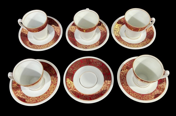 • Jogo de 5 xícaras de café e 6 pires, Porcelana Real, com rica decoração em vinho e ouro. Aparelho de porcelana brasileira da metade do século XX. Marcas do tempo. -dim- 10,5d pires 5,5d x 5,5a xícara