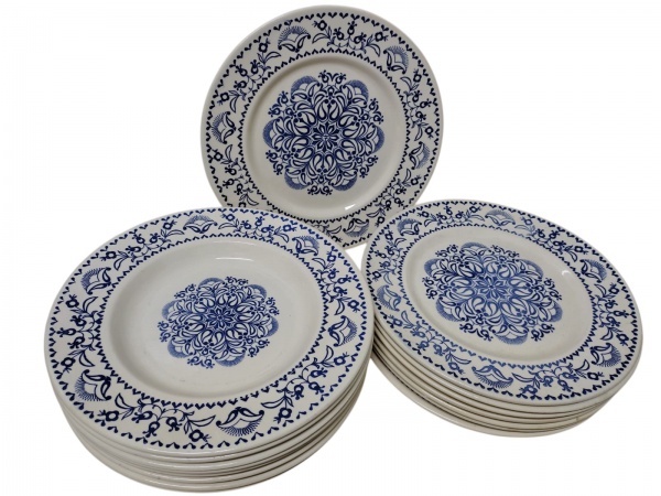 • Lote contendo 16 Pratos Porto Ferreira produzidos em faiança, sendo 8 rasos e 8 fundos, com clássica decoração em azul cobalto sob o esmalte. -dim- rasos (23,5 cm) / fundos (23 cm).