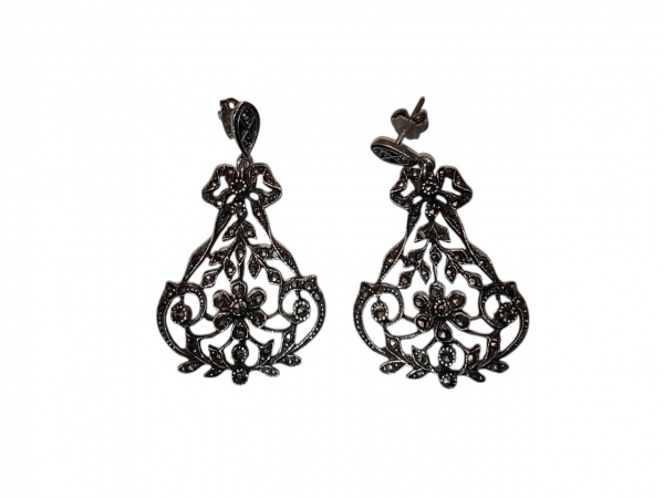 • Magnífico par de brincos vintage produzidos em prata portuguesa com marcassitas , detalhe vazado em arabesco floral e laço. Marcas do tempo. -dim- 4,5 cm x 2,5 cm.