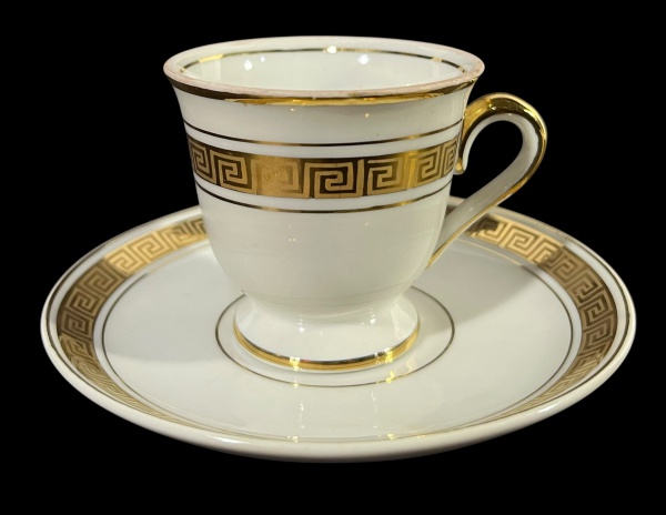 • Lote composto por uma xícara e pires de porcelana Mauá, com alça e bordas em ouro. A decoração dourada apresenta o clássico padrão de meandros gregos. Marcas do tempo. -dim- 5,5d 5a xícara/ 10d pires