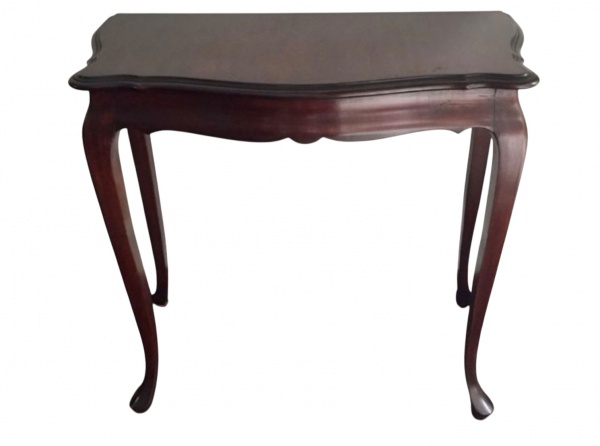 • Leandro Martins. Mesa de encostar de madeira nobre com saia levemente ondulada e com pernas elegantes. Móvel ainda com suas referências da Casa Leandro- Fábrica de móveis. - dim  -90x45x80