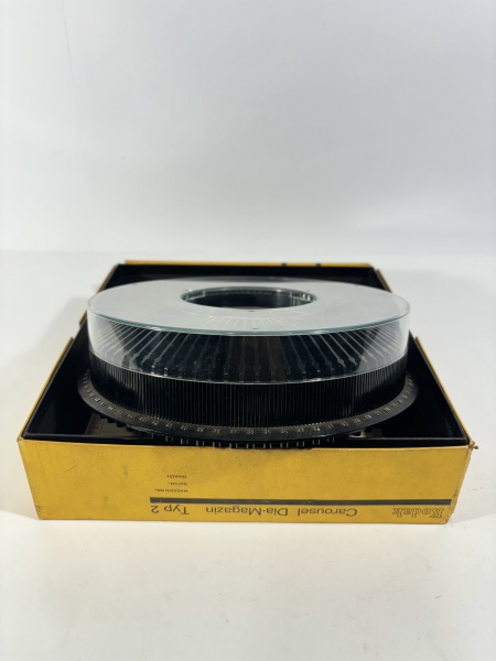 • Colecionismo KODAK - Antigo suporte para slide em material sintético preto com tampa de acrílico translúcido, acompanha caixa original (produto não testado) - dim -