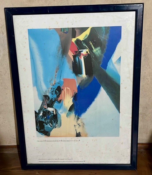 • Quadro de arte abstrata com tom principal em azul e alguns escritos Paul Jenkins em moldura de Madeira - dim- 57x75x3