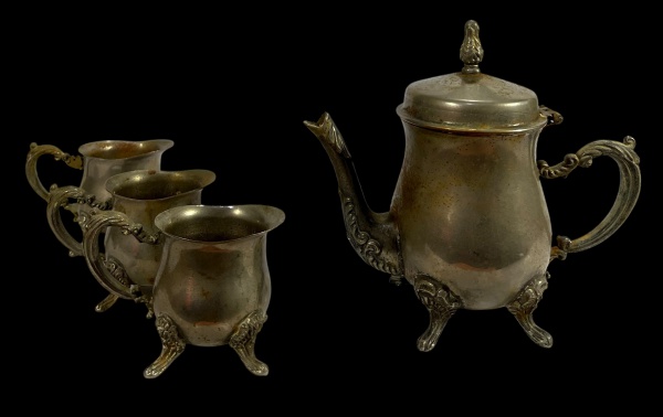 • Lote de Quatro (4) Peças Miniatura para Café/Chá, Metal Banhado a Prata, Estilo Vitoriano, com Pés Garra; Bule e Três Cremeiras/Leiteiras. Marcas do tempo, no estado. -dim- 15x7x13 bule / 8x5x5 Leiteira