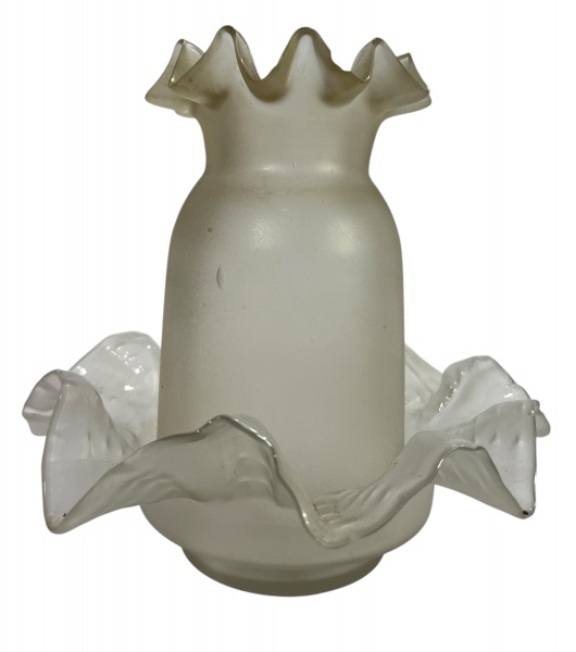 • Elegante par de vidros antigos, perfeito como peça decorativa ou para restauro de luminárias. Conjunto com cúpula/chaminé de vidro fosco babado e porta-cúpula/base transparente prensada, exalando o charme do período Vitoriano. Marcas do tempo. -dim- 16d 6a base 8d 14a copo