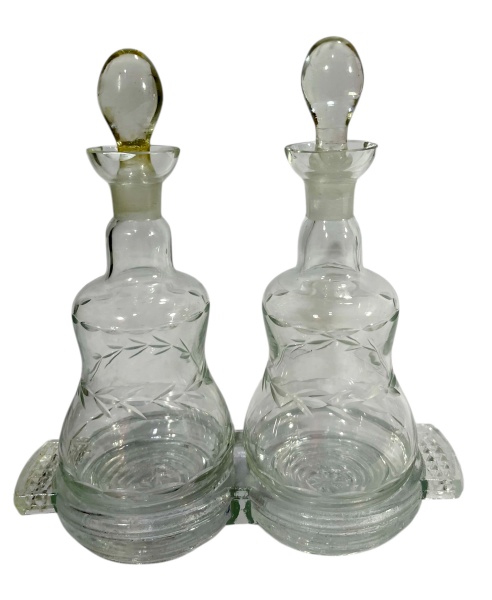 • Conjunto Galheteiro Duplo Antigo em Vidro Prensado (Cruet Set), composto por duas garrafas com rolhas de vidro e base unificada. Padrão de folhagem/ramagem gravado na ampulheta, com base prensada com estrela e alças decoradas. Marcas do tempo. -dim- base 18x8 garrafa 7d 17a