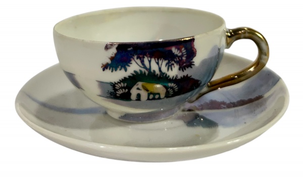 • Antiga xícara de café e pires em porcelana no estilo japonês Lusterware. Peça de coleção com rica decoração paisagística iridescente e alça dourada. Marcas do tempo. -dim- 7x6x3 xic / 9,5d pires