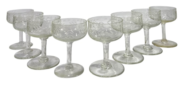 • Lote de 8 taças vintage tipo Coupe/Licor em vidro fino incolor, com rica gravação de folhagens e base simples; peças antigas de coleção. Marcas do tempo. -dim- 8,5d x 10a