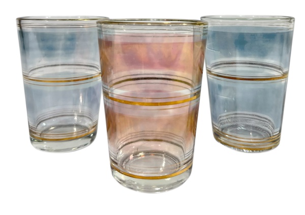 • Lote com 3 copos Nadir Figueiredo vintage, de vidro com faixas douradas e pintura esmaltada, sendo 2 azuis e 1 iridescente/rosa. Peças brasileiras clássicas dos anos 60/70 em bom estado de conservação. Marcas do tempo. -dim- 6d x 8,5a