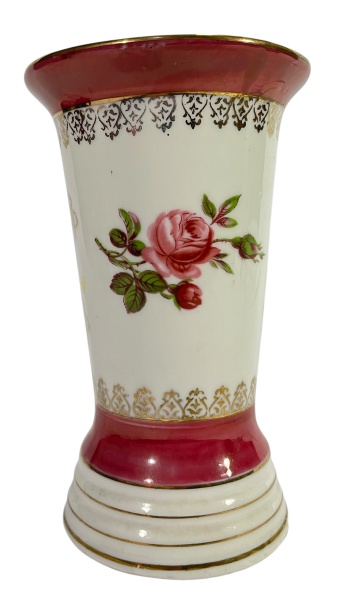 • Vaso em porcelana Sta. Rosa Pedreira antigo, com decoração de rosa em policromia, esmaltes vermelho/vinho e filetes/detalhes em ouro. Peça com marca da manufatura e número de modelo no fundo. Marcas do tempo. -dim- 10d x 16a