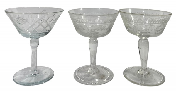 • Lote de Três (3) Taças Coupe Vintage em Vidro fino lapidado, apresentando haste curta e decorações gravadas a ácido/lapidadas com padrões distintos. Marcas do tempo. -dim- 10d 11,5a maior 9d 11a menor