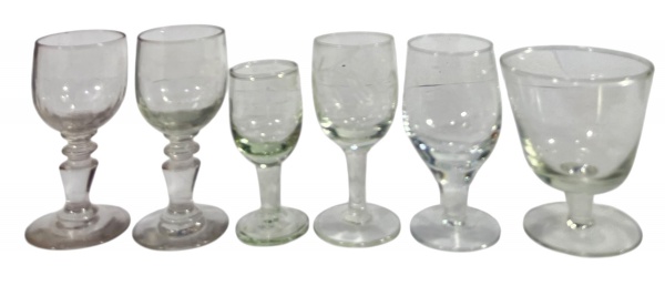 • Lote de 6 Cálices/Taças Antigas de Vidro/Cristal, Haste Curta, para licor ou vinho do Porto, apresentando variações de bojo, detalhes canelados e um exemplar com gravação em ácido (floral). Marcas do tempo. -dim- menor 3d 7,5a maior 6,5d 8a