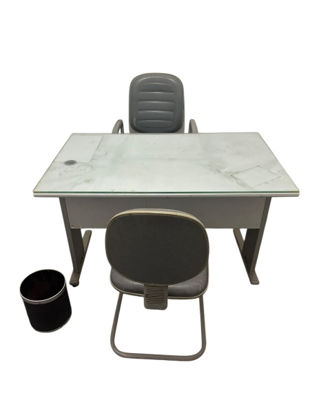 • Lote com móveis de escritório mesa com tampo de vidro e duas cadeiras e lixeira - dim -120x76x80- RETIRADA POR CONTA DO COMPRADOR NO BAIRRO DO ESTÁCIO
