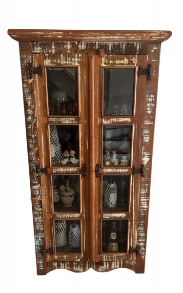 • Armário coluna em madeira de demolição , portas frontais envidraçadas, patina branca com detalhes em ferro fundido - dim - 97x55x1,80