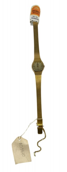 • Relógio de pulso feminino Orient Quartz vintage dourado, referência A05840, com etiquetas originais, necessitando revisão/manutenção. No estado.