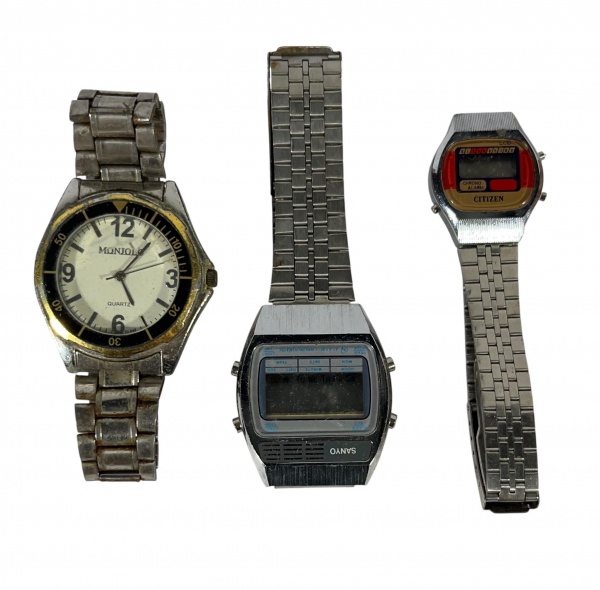 • Lote c/ 3 Relógios de Pulso Vintage, Marcas SANYO, CITIZEN (ambos digitais) e MUNIQUE Quartz, com pulseiras de metal. Itens no estado das fotos, ideais para colecionismo ou restauro.