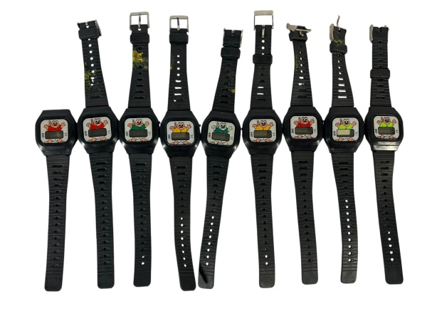 • Lote c/ 9 Relógios Digitais Infantis Vintage/Retrô c/ Personagens Coloridos (Dec. 80/90), pulseiras pretas, estado de conservação variado. Itens necessitando revisão/manutenção. No estado.