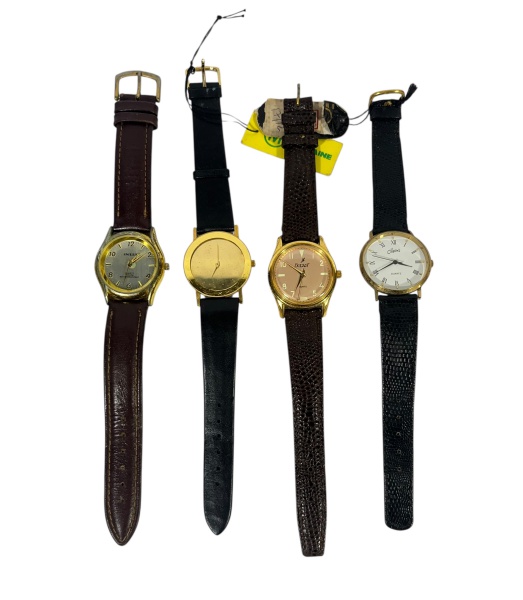 • Lote de 4 relógios de pulso de quartzo (quartzo), vintage/usados, de tom dourado/simples, incluindo as marcas STAR e Opal. Ideal para revenda, reparo ou peças; condição e funcionalidade não testadas.