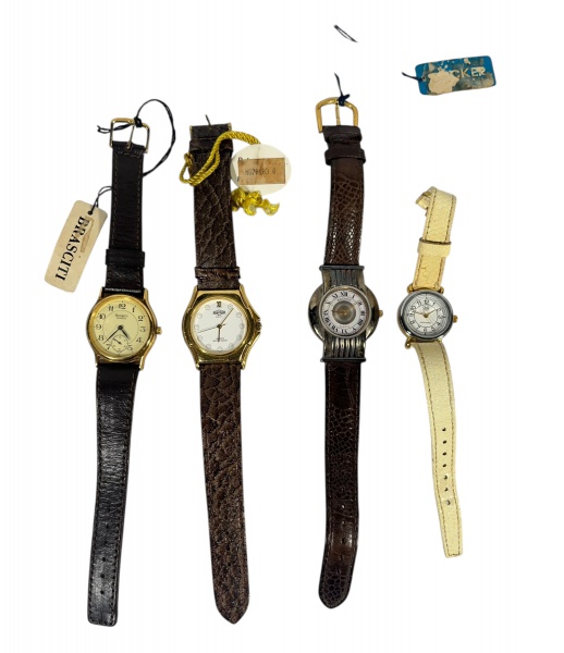 • Lote de 4 relógios de pulso vintage / de marcas de moda (Brasciti, Magnum, Backer) com caixas douradas e prateadas; itens necessitando revisão/manutenção. No estado.