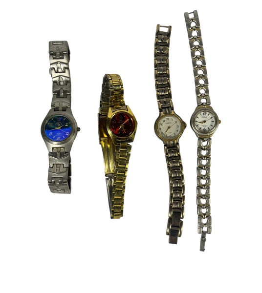 • Lote contendo 4 relógios femininos de pulso Quartz (Hollywood Polo, Orient, Condor e outras), pulseiras de metal, sortimento de cores e estilos, itens necessitando revisão/manutenção. No estado.