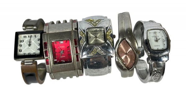 • Lote de 5 Relógios Femininos Vintage/Retrô em Estilo Bracelete, Quartzo. Inclui peças com design Guess e Guuci; itens necessitando revisão/manutenção. No estado.