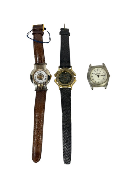 • Lote com 3 relógios de pulso/caixas vintage (dois completos, um apenas caixa e mostrador) de movimento Quartz, incluindo um Geneva e modelos estilo clássico com algarismos romanos, ideais para restauração ou peças. No estado.