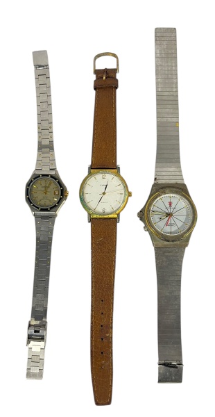 • Lote c/ 3 Relógios de Pulso Quartz Vintage (Anos 80/90) de diferentes marcas e estilos, com caixas e pulseiras sortidas (metal, couro e elástica). Necessitam de revisão/troca de bateria; no estado.