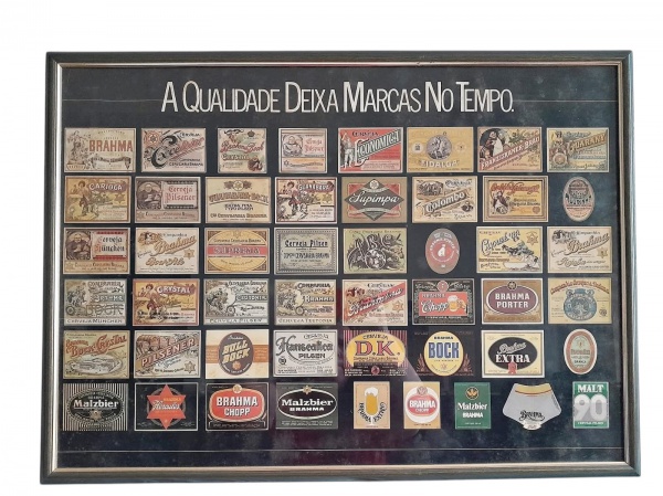 • Quadro com vidro, da antiga fábrica de cerveja Brahma, com 49 rótulos históricos impressos em painel com os dizeres A Qualidade Deixa Marcas no Tempo, expondo a evolução do design e variedade de estilos na produção de cervejas ao longo do tempo. Marcas do tempo. -dim- 77x56